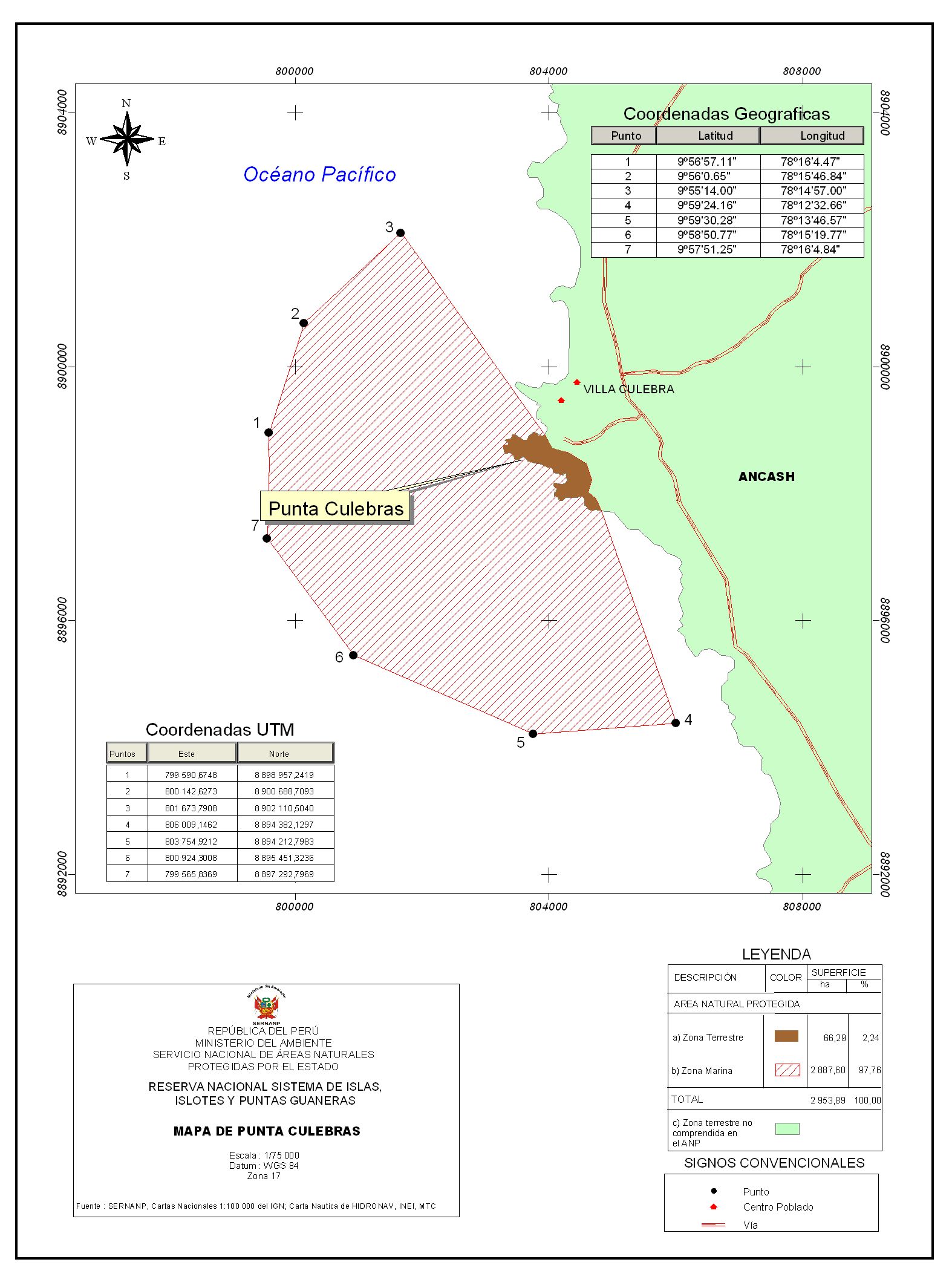Este mapa muestra el ámbito de la Punta Culebras, ubicada en Áncash, perteneciente al Sistema de Islas, Islotes y Puntas Guaneras según el Servicio Nacional de Áreas Naturales Protegidas - SERNANP. Enero de 2010.