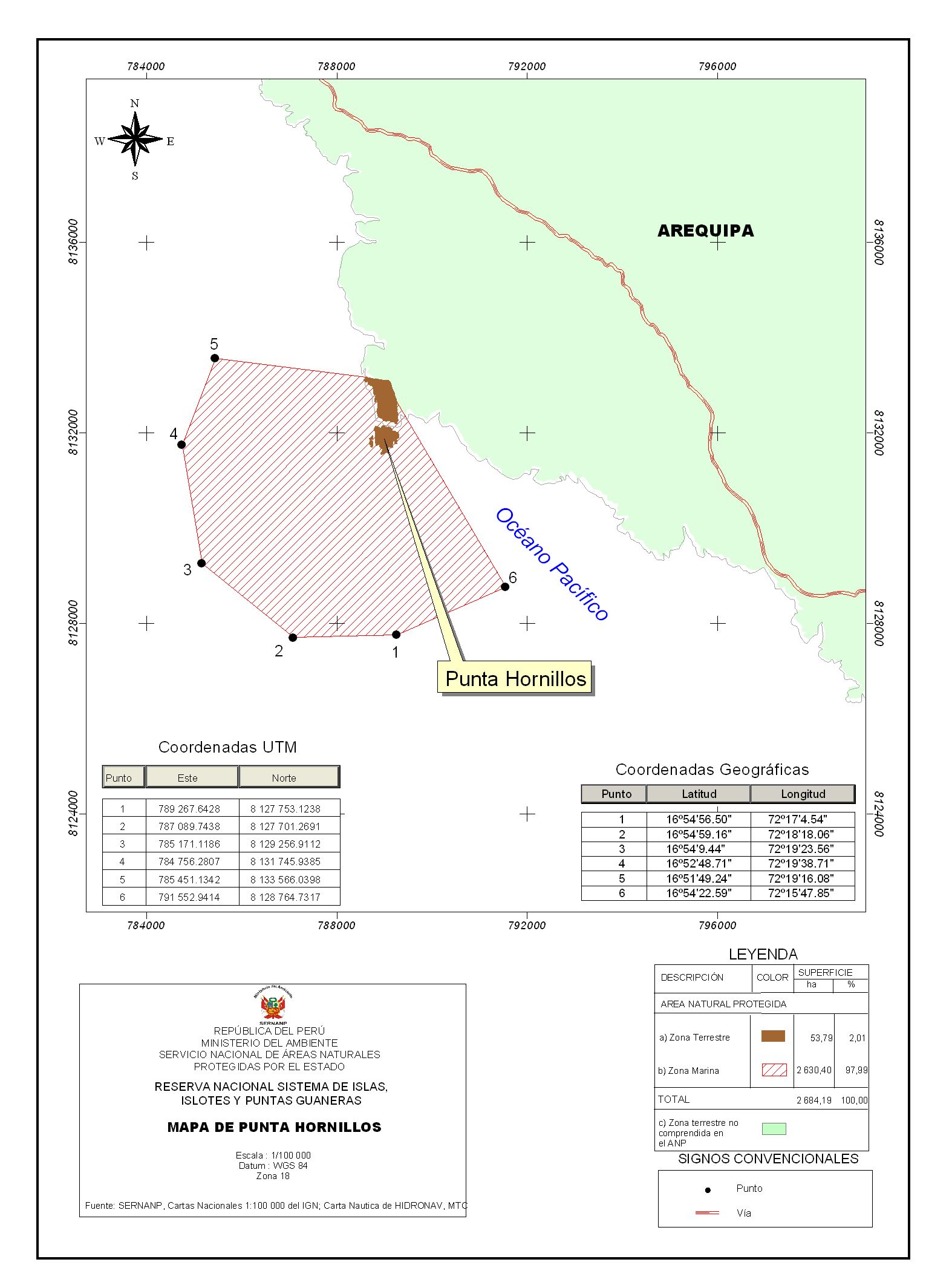 Este mapa muestra el ámbito de la Punta Hornillos, ubicada en Arequipa, perteneciente al Sistema de Islas, Islotes y Puntas Guaneras según el Servicio Nacional de Áreas Naturales Protegidas - SERNANP. Enero de 2010.