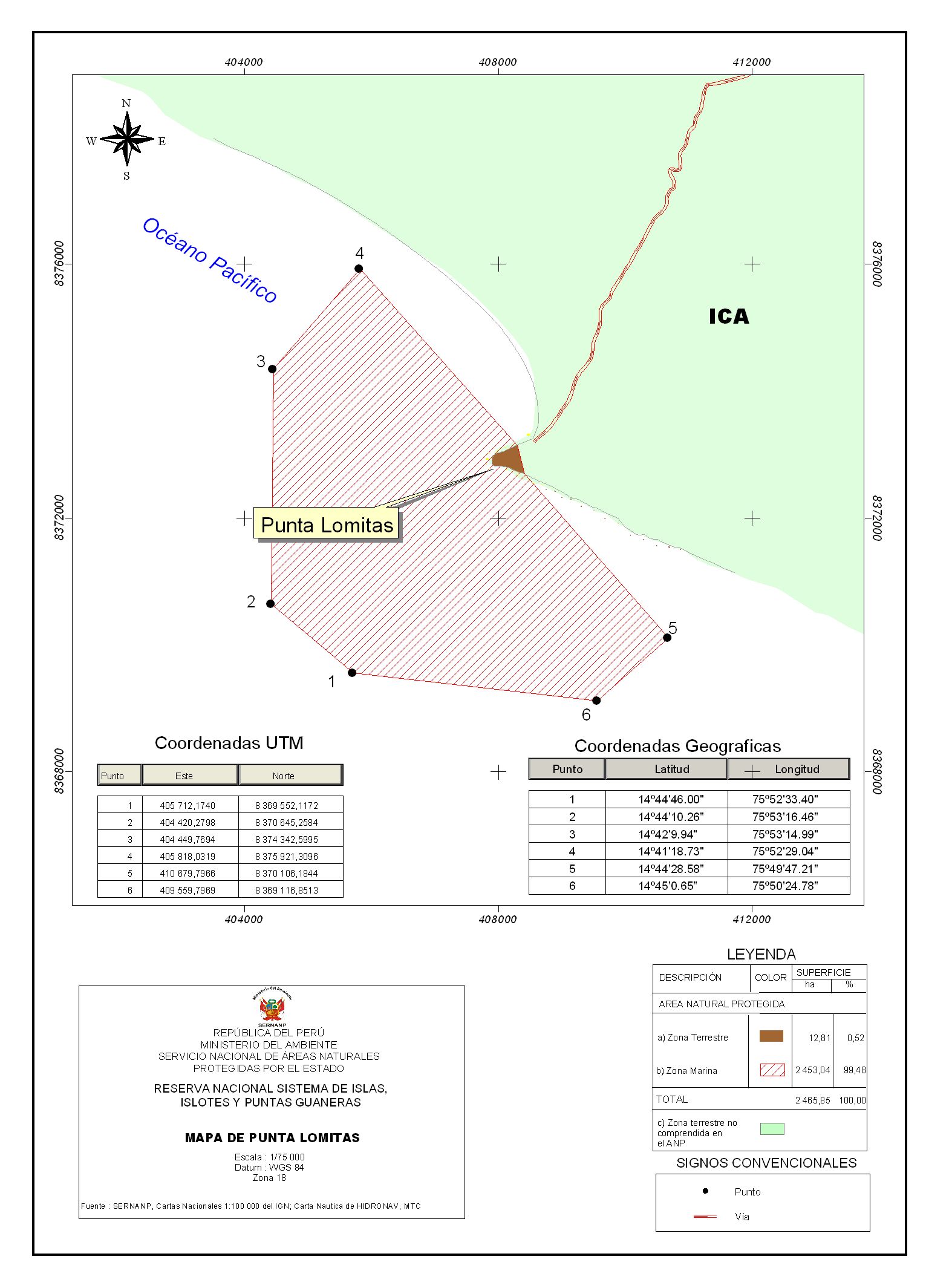 Este mapa muestra el ámbito de la Punta Lomitas, ubicada en Ica, perteneciente al Sistema de Islas, Islotes y Puntas Guaneras según el Servicio Nacional de Áreas Naturales Protegidas - SERNANP. Enero de 2010.