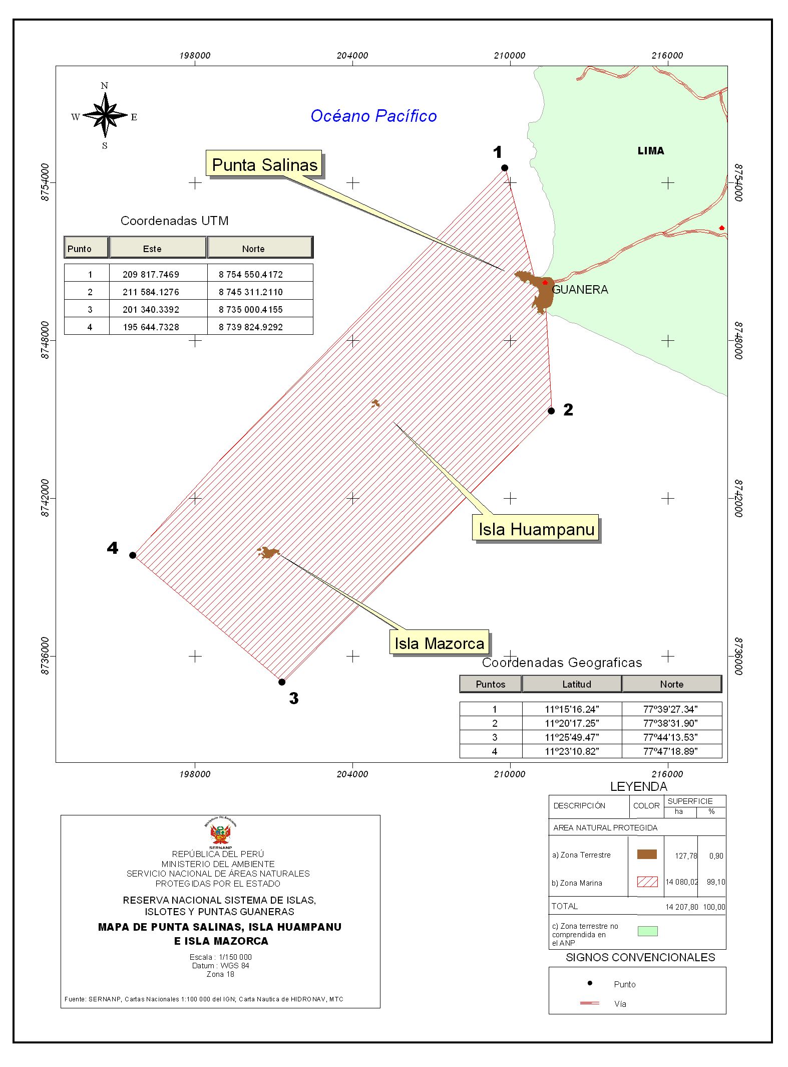 Este mapa muestra el ámbito de la Punta Salinas y las Islas Huampanu y Mazorca, ubicadas en Lima, perteneciente al Sistema de Islas, Islotes y Puntas Guaneras según el Servicio Nacional de Áreas Naturales Protegidas - SERNANP. Enero de 2010.