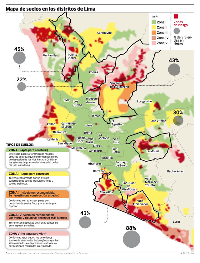 El mapa muestra información sobre la situación de vulnerabilidad de los distritos de Lima Metropolitana, la calidad de los suelos, las zonas de riesgo, y la clasificación que se realiza.