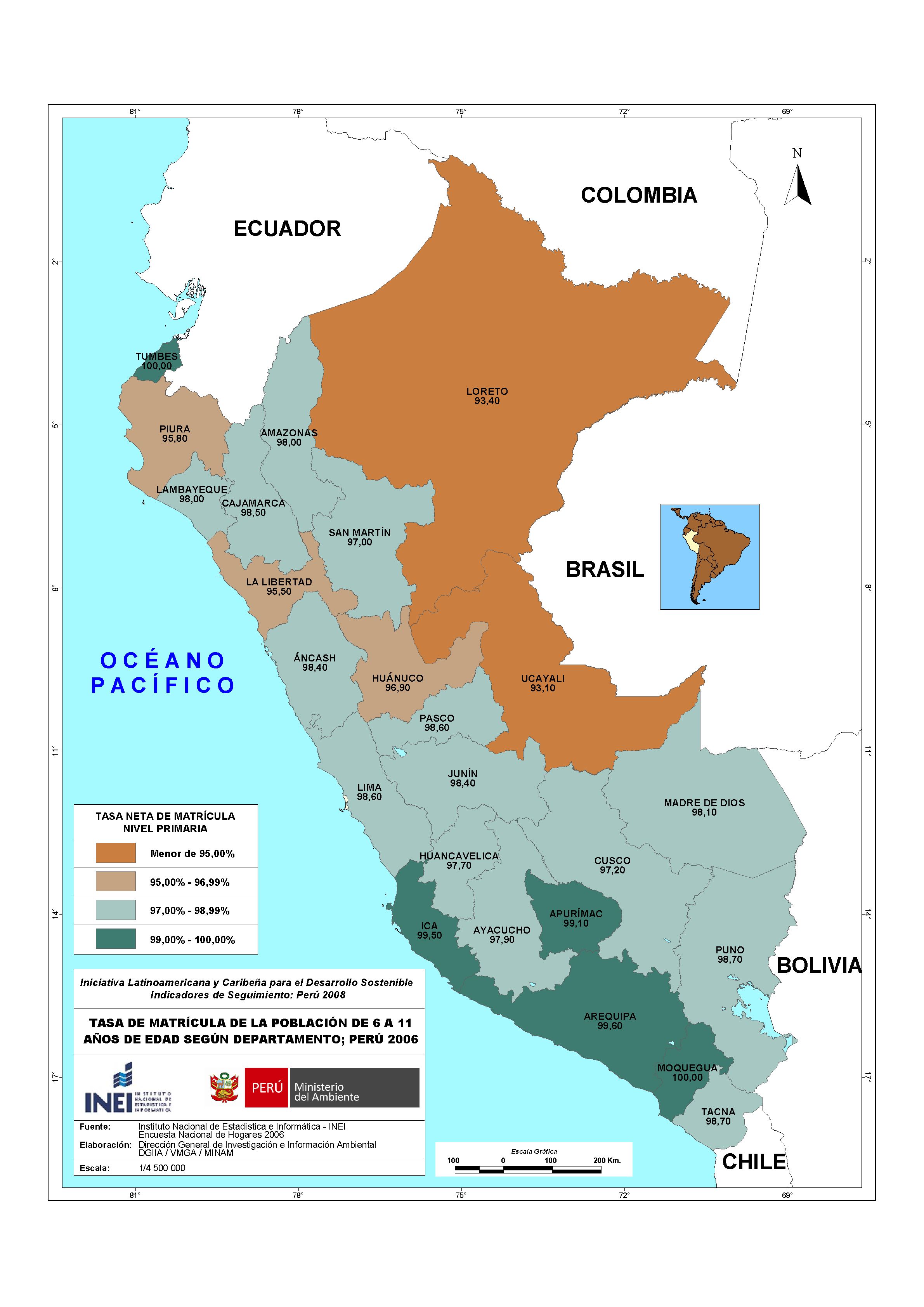 Este mapa muestra la tasa de matrícula de la población de 6 a 11 años de edad al año 2006; según el Instituto Nacional de Estadística e Informática - INEI. Este mapa representa el indicador: Tasa neta de matriculación en la enseñanza primaria.