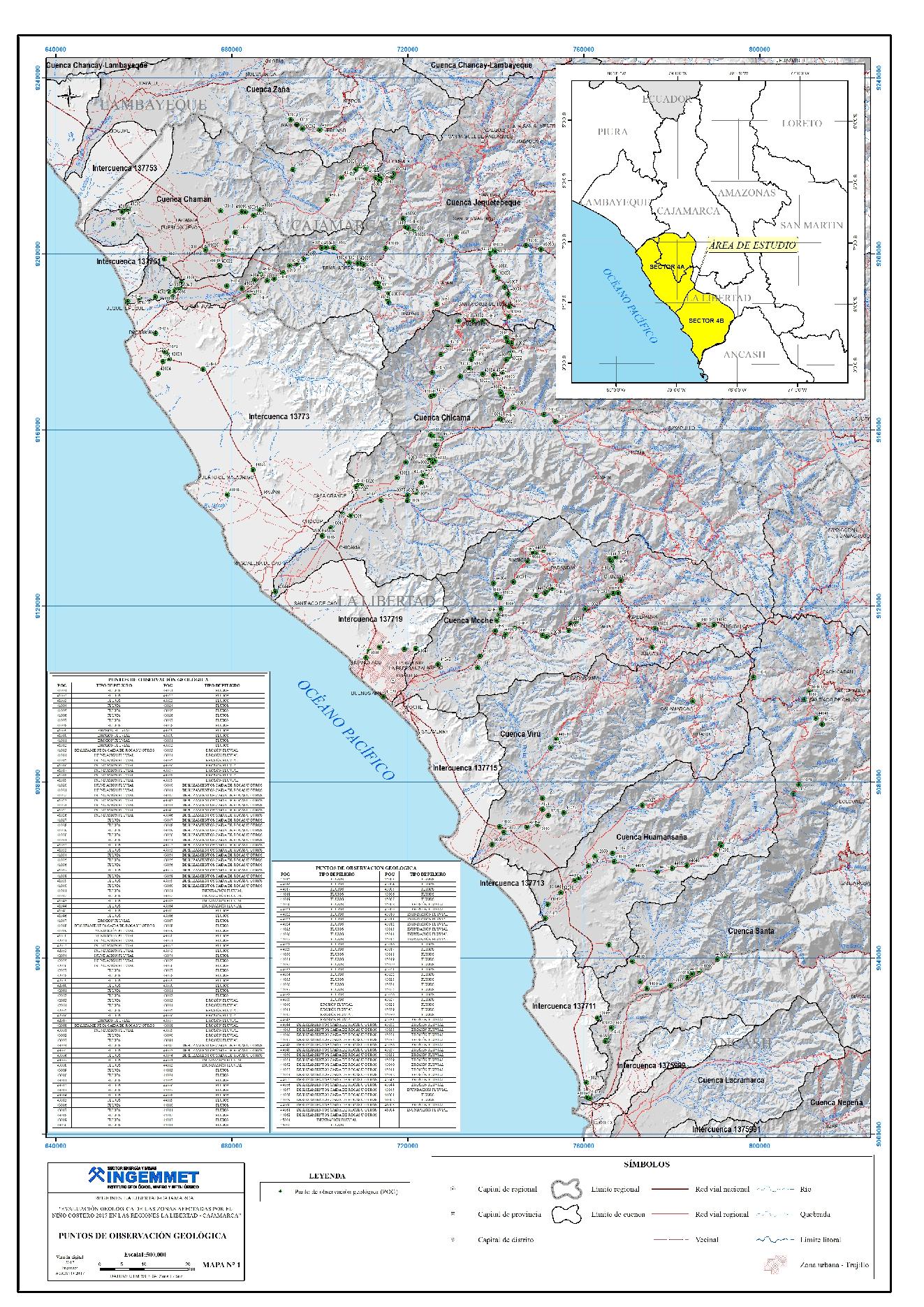 Puntos de observación geológica. Evaluación Geológica de las zonas afectadas por el Niño Costero 2017 en las regiones La Libertad - Cajamarca. Mapa N° 01