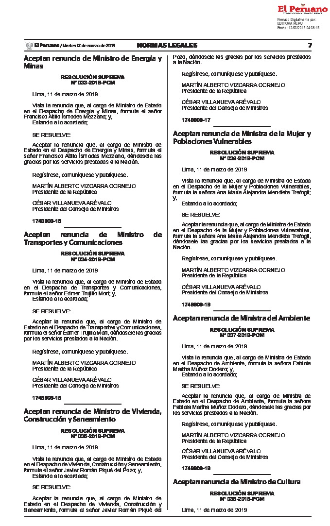 Resolución acepta la renuncia que, al cargo de Ministra de Estado en el Despacho de Ambiente, formula la señora Fabiola Martha Muñoz Dodero.