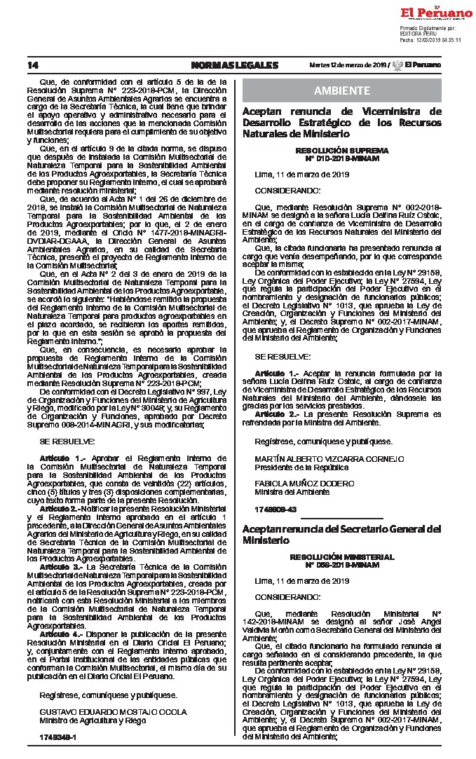 Resolución acepta la renuncia formulada por la señora Lucía Delfina Ruíz Ostoic, al cargo de confianza de Viceministra de Desarrollo Estratégico de los Recursos Naturales del Ministerio del Ambiente.