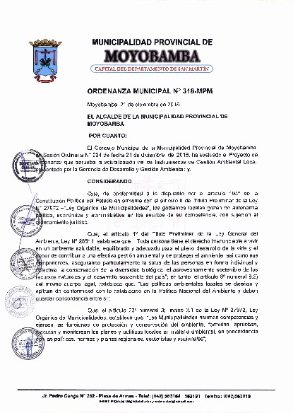 La Municipalidad Provincial de Moyobamba a taves del Consejo ejecutivo Ambiental Provincial-CEAP, paueba sus instrumentos de Gestion Ambiental con el fin de llevar a cabo acciones concretas destinadas a logar los objetivos planteados en las policas nacionales y regionales.