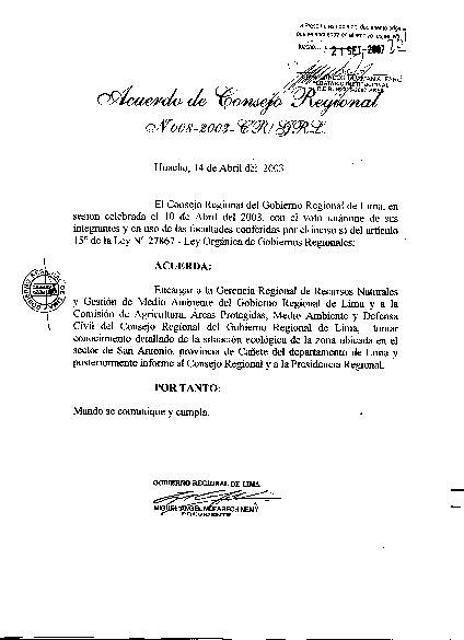 Encargar a la Gerencia Regional de recursos Naturales y Gestión de Medio Ambiente del gobierno Regional de Lima y a la Comisión de Agricultura, Áreas Protegidas, Medio Ambiente y Defensa civil del Consejo Regional del Gobierno Regional de Lima, tomar conocimiento detallado de la situación ecológica de la zona ubicada en el sector San Antonio, provincia de Cañete del departamento de Lima y posteriormente informe al Consejo Regional y a la Presidencia Regional.