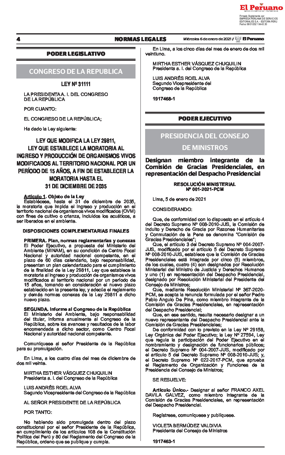 La presente ley establece que, hasta el 31 de diciembre de 2035, la moratoria que impida el ingreso y producción en el territorio nacional de organismos vivos modificados (OVM) con fines de cultivo o crianza, incluidos los acuáticos, a ser liberados en el ambiente.