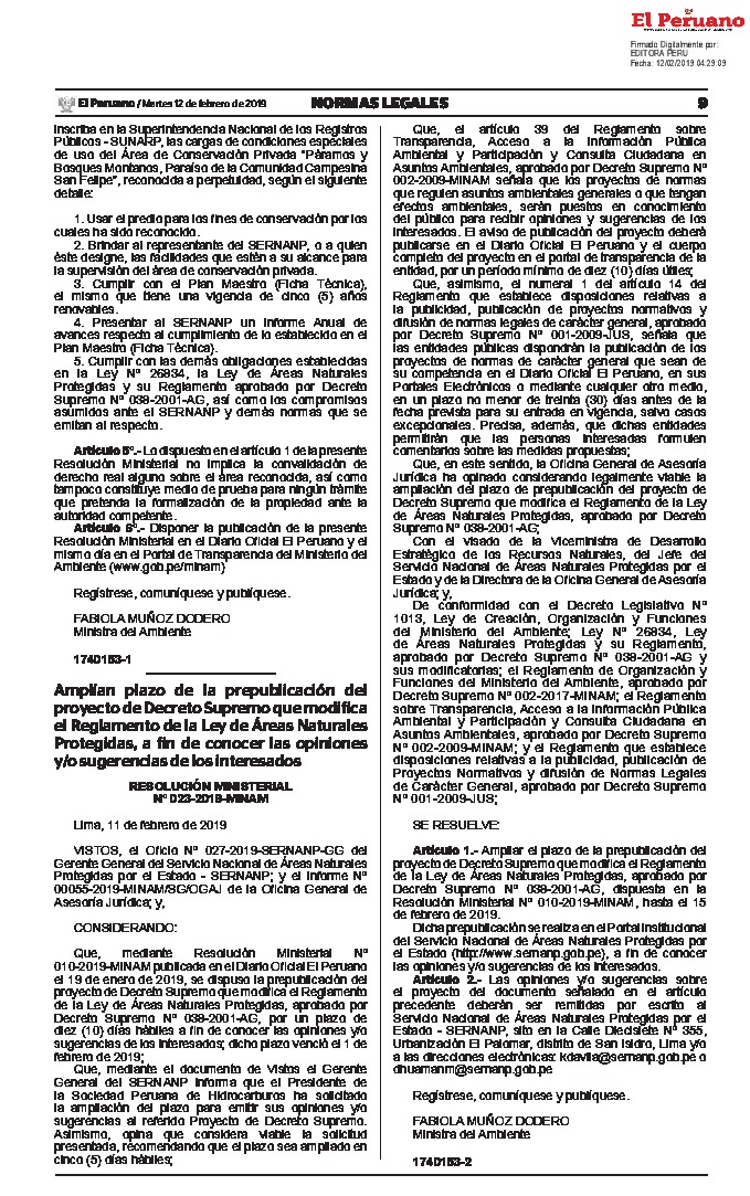 La siguiente resolución amplia el plazo de la prepublicación del proyecto de Decreto Supremo que modifica el Reglamento de la Ley de Áreas Naturales Protegidas, aprobado por Decreto Supremo Nº 038-2001-AG, dispuesta en la Resolución Ministerial Nº 010-2019-MINAM, hasta el 15 de febrero de 2019.