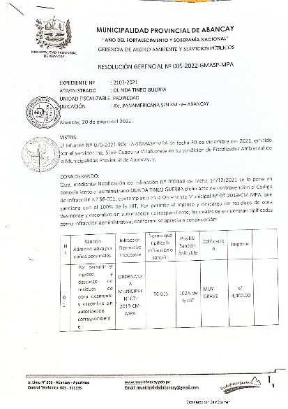 APERTURA PROCEDIMIENTO SANCIONADOR (PAS) en contra administrado OLINDA TINEO GUERRA identificado con DNI Nº 46720206, por haber infringido la normatividad contenida en los códigos de infracción Nº 056-015 la ORDENANZA MUNICIPAL Nº 07-2019-CM-MPA, por permitir el ingreso y descargo de Residuos sólidos de obra desmonte y escombros en su propiedad sin autorización correspondiente.