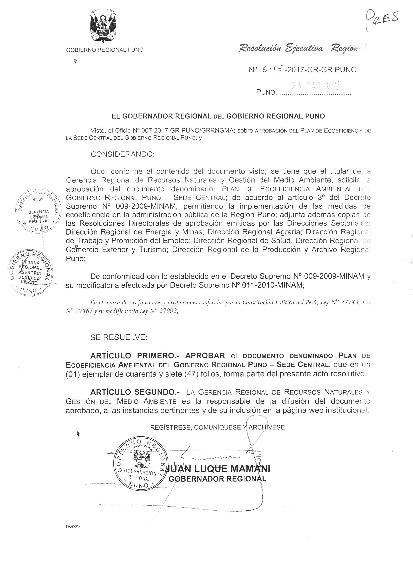 APROBACIÓN DEL PLAN DE ECOEFICIENCIA AMBIENTAL DEL GOBIERNO REGIONAL-SEDE CENTRAL, permitiendo la implementación de las medidas cie ecoeficiencia en la administración pública de la Región Puno.