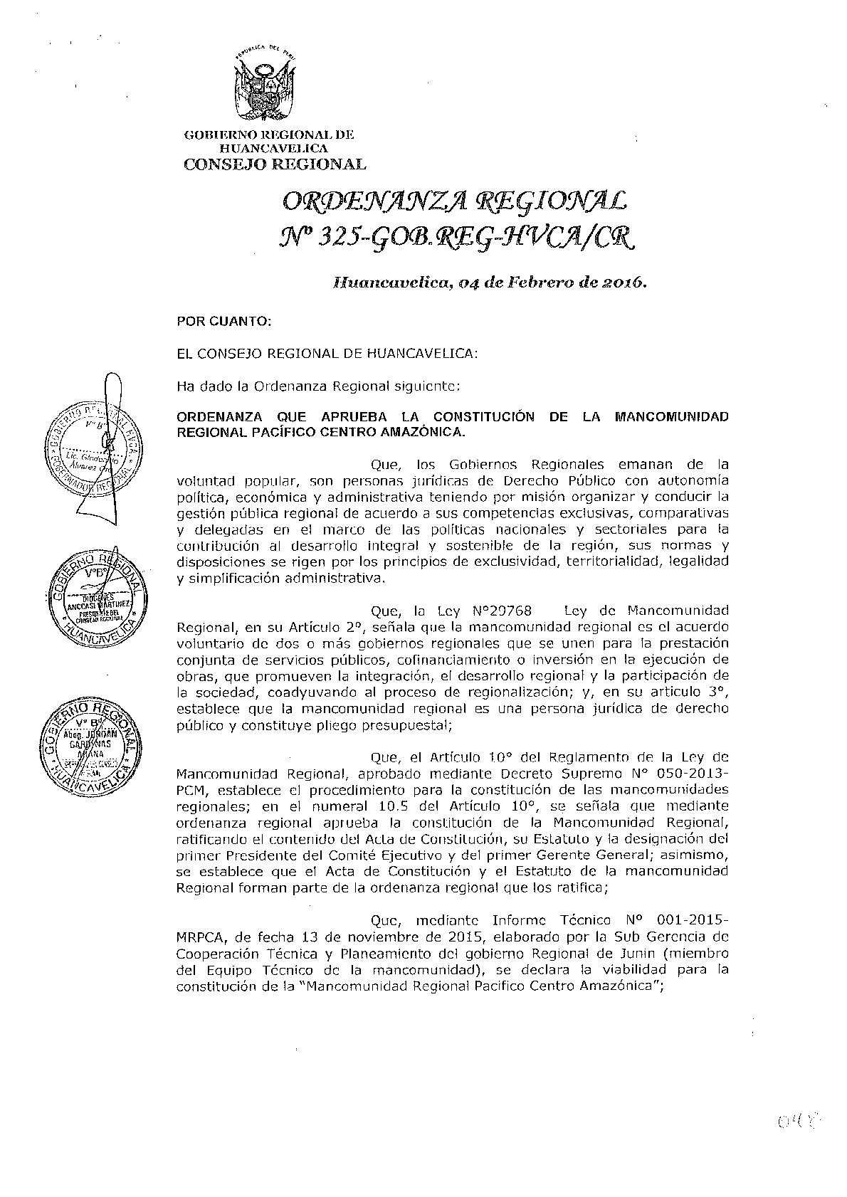 ORDENANZA REGIONAL N° 325-GOB.REG-HVCA