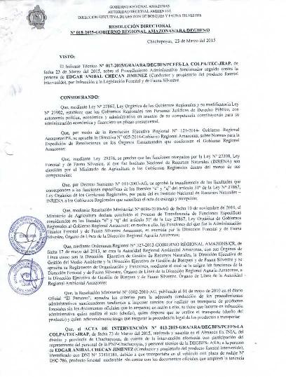 Visto el Informe Técnico N° 017-2015/GRA/ARA/DEGBFS/PCFFS-LA COLPA/TEC-JRAP, de fecha 23 de Marzo del 2015, sobre el Procedimiento Administrativo Sancionador seguido contra la persona de EDGAR ANIBAL CHECAN JIMENEZ(Conductor y propietario del producto forestal intervenido), por Infracción a la Legislación Forestal y de Fauna Silvestre.