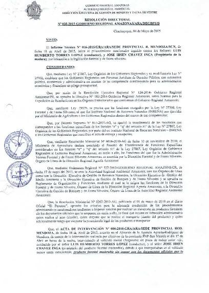 Visto el Informe Técnico N° 016-2015/GRA/ARA/SEDE PROVINCIAL R.MENDOZA/SCN, de fecha 18 de Abril del 2015, sobre el procedimiento sancionador seguido contra los señores: LUIS HUMBERTO TORRES LOPEZ(conductor), y JOSE IBSEN CHAVEZ INGA (propietario de la madera); por infracción a la legislación forestal y de fauna silvestre.