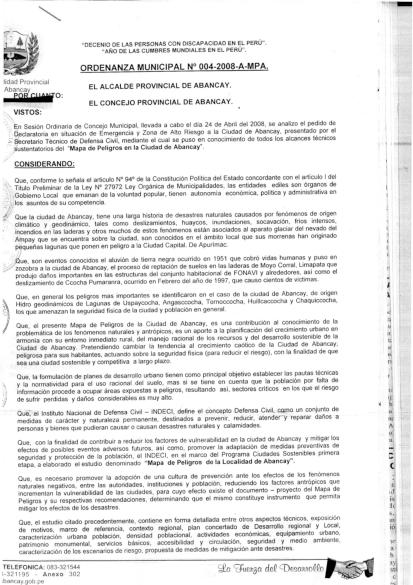 ART. 1º.- APROBAR, LOS ESTUDIOS DEL MAPA DE PELIGROS DE LA LOCALIDAD DE ABANCAY DEL PROGRAMA DE CIUDADES SOSTENIBLES, con la finalidad de contribuir a reducir los factores de riesgos y vulnerabilidad en la ciudad de Abancay y mitigar los efectos de los posibles eventos adversos futuros; promoviendo la adopción de medidas preventivas de seguridad y protección de la población, revirtiendo el crecimiento caótico de la ciudad, concentrando esfuerzos en la seguridad física reduciendo riesgos, posibilitando la utilización de áreas de expansión urbana protegidas en beneficio de la población.