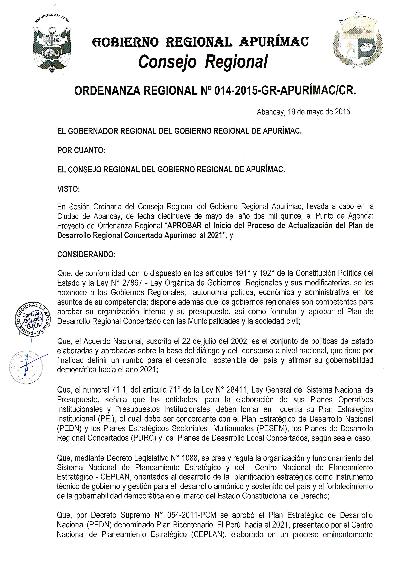 Que, el Plan de Desarrollo Regional Concertado Apurímac al 2021, aprobado con Ordenanza Regional N° 056-2010-CR-APURIMAC, de fecha 22 de Noviembre del 2010, debe ser actualizada en función de los nuevos contextos nacionales e internacionales considerando los lineamientos establecidos en la Dirección General del proceso de Planeamiento Estratégico aprobado por el Centro de Planeamiento Estratégico - CEPLAN, razón por el cual es necesario convocar la participación de los actores involucrados para la Actualización del Plan de Desarrollo Regional Concertado del Gobierno Regional de Apurímac al 2021 (PDRC), documento donde se definirán los objetivos estratégicos, políticas y metas a ser cumplidas en dicho periodo, recogiendo las demandas y propuestas de desarrollo, a fin de viabilizar el logro de la visión regional de largo plazo, que servirá de marco referente para la formulación de Plan Estratégico institucional 2015- 2018