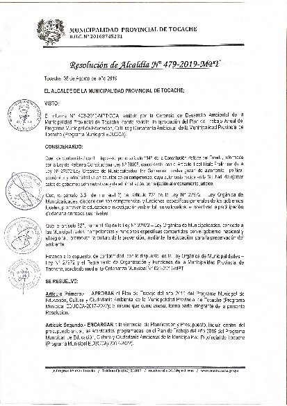 Artículo primero.- Aprobar el Plan de Trabajo del año 2019 del Programa Municipal de Educación, Cultura y Ciudadanía Ambiental de la Municipalidad Provincial de Tocache (Programa Municipal EDUCCA 2017-2022).