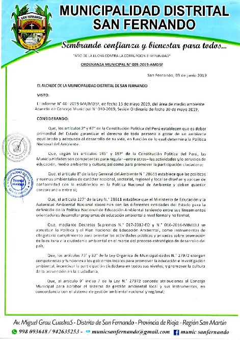 Que en el artículo primero se Aprueba el Programa de Educación, Cultura y Ciudadanía Ambiental de la Municipalidad Distrital de San Fernando 2019-2022.