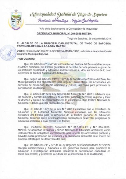 Que en el artículo primero se Aprueba el Programa de Educación, Cultura y Ciudadanía Ambiental de la Municipalidad Distrital de Tingo de Saposoa 2019-2022.