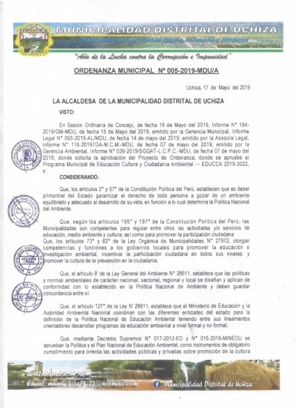 Que en el artículo primero se Aprueba el Programa de Educación, Cultura y Ciudadanía Ambiental de la Municipalidad Distrital de Uchiza 2019-2022.