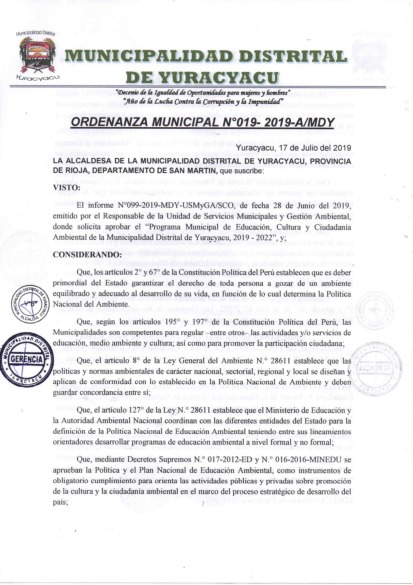 Que en el artículo primero se Aprueba el Programa de Educación, Cultura y Ciudadanía Ambiental de la Municipalidad Distrital de Yuracyacu 2019-2022.