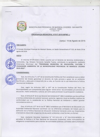 Que en el artículo primero se Aprueba el Programa de Educación, Cultura y Ciudadanía Ambiental de la Municipalidad Distrital de Juanjui 2019-2022.