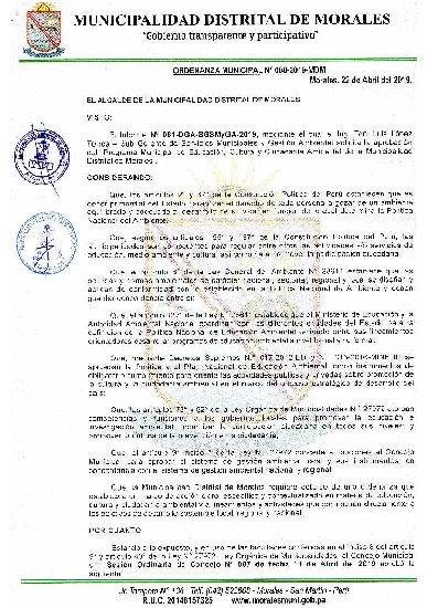 Que en el artículo primero se Aprueba el Programa de Educación, Cultura y Ciudadanía Ambiental de la Municipalidad Distrital de Morales 2019-2022.