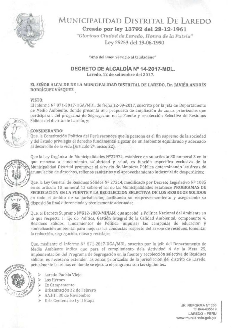 Aprobar, al Programa de Segregación en la Fuente y Recolección Selectiva de Residuos Sólidos en el distrito de Laredo