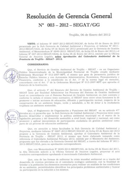 La Resolución de Gerencia General Nº 003-2012-SEGAT/GG aprueba el Calendario Ambiental de la Provincia de Trujillo - SEGAT 2012, el cual se encuentra adjuntado por fechas y meses en el presente documento.