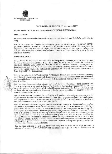 Aprueba el cambio de zonificación del predio de residencial densidad media a comercio zonal ubicado en la Av. Mochica sector La Esperancita, Distrito y Provincia de Trujillo. Mediante esta Ordenanza se modifica el Plano de Zonificación General de Usos de Suelo del Continuo Urbano de Trujillo N° 002-011-ZT, aprobado por Ordenanza Municipal N° 031-2012-MPT.