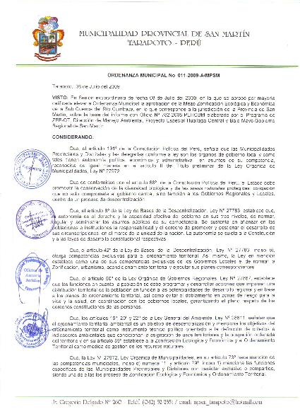 Ordenanza que aprueba la MESO ZONIFICACIÓN ECOLÓGICA ECONÓMICA Y ORDENAMIENTO TERRITORIAL de la Sub Cuenca del Río Cumbaza