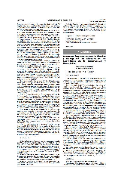 Aprueba el Reglamento para la Gestión y Manejo de los Residuos de las Actividades de las Construcción y Demolición