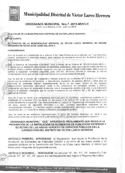 Aprueba el reglamento que regula la prohibición de la instalación de elementos de publicidad exterior y su retiro de las áreas verdes y de espacios públicos en la jurisdicción del Distrito de Víctor Larco Herrera, el mismo que forma parte integrante de la presente norma.