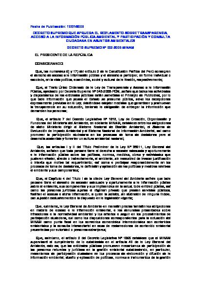 Aprueba el reglamento sobre transparencia, Acceso a la información pública ambiental y participación y consulta Ciudadana en asuntos ambientales