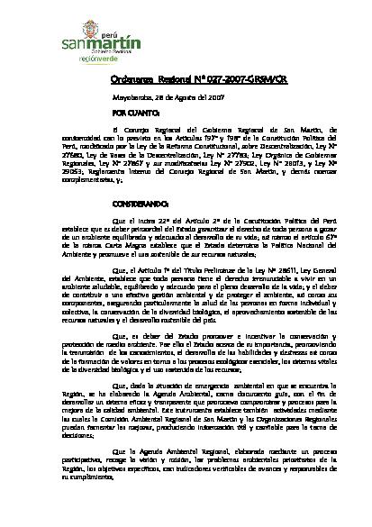 Ordenanza Reqional que aprueban la Agenda Ambiental Regional 2005- 2007, elaborado por la Comisión Ambiental Regional de San Martín, en un proceso participativo y consensuado con los diferentes actores públicos y privados de la Región San Martín.