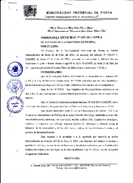 A tarvés de la presente Ordenanza Municipal se aprueba el Cuadro Único de Infracciones y Sanciones- CUIS de la MPP