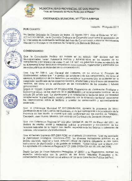 Ordenanza Municipal que Aprueba la delimitación territorial del área de conservación ambiental "MICROCUENCA ALTA DEL RIO SHILCAYO"
