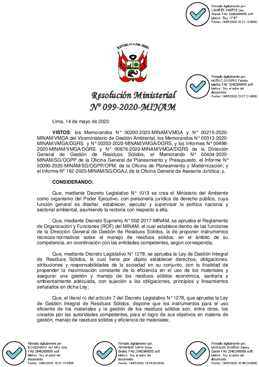 Aprueban el documento “Recomendaciones para el manejo de residuos sólidos durante la Emergencia Sanitaria por COVID-19 y el Estado de Emergencia Nacional en domicilios, centros de aislamiento temporal de personas, centros de abasto, bodegas, locales de co