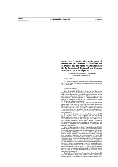 Por medio de la presente norma se aprueba, la donación dineraria no reembolsable de la Agencia Internacional de Desarrollo de los Estados Unidos (USAID), a favor del Proyecto Especial Madre de Dios, por un monto de $ 250,000.00 (DOSCIENTOS CINCUENTA MIL CON 00/100 DÓLARES AMERICANOS), con el objeto de desarrollar actividades en los Programas de Gestión de Cuencas Hidrográfi cas, Cambio Climático, Minería e Hidrocarburos, dentro del marco del Proyecto: ?Consolidación de la Capacidad Regional en Gestión Ambiental para el Siglo XXI.