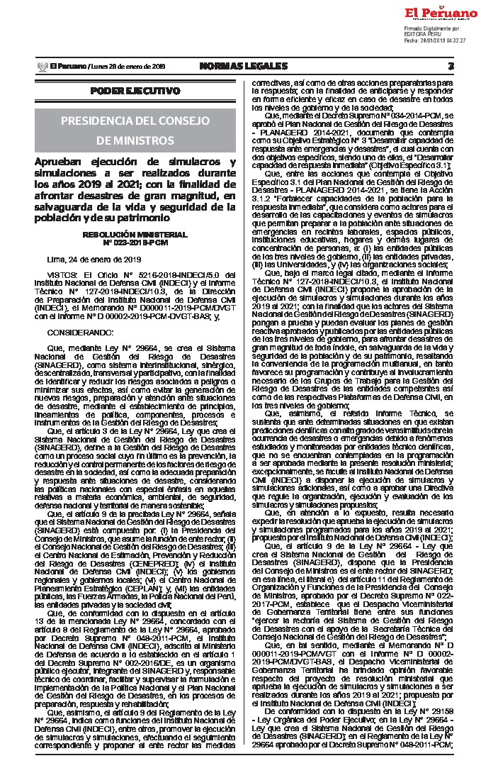 Aprueban ejecución de simulacros y simulaciones a ser realizados durante los años 2019 al 2021; con la finalidad de afrontar desastres de gran magnitud, en salvaguarda de la vida y seguridad de la población y de su patrimonio