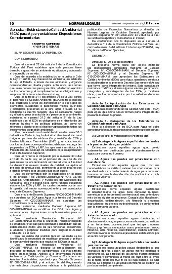 APRUEBAN ESTÁNDARES PARA CALIDAD AMBIENTAL (ECA) PARA AGUA Y ESTABLECEN DISPOSICIONES COMPLEMENTARIOS