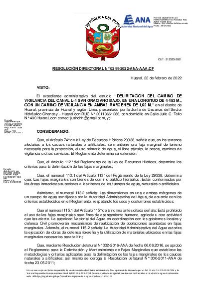 De conformidad con la Ley de Recursos Hídricos 29338, su Reglamento de la Ley de Recursos Hídricos, aprobado por Decreto Supremo N° 001-2010- AG, y el Reglamento para la Determinación y Mantenimiento de Fajas Marginales, aprobado mediante Resolución Jefatural N° 332-2016-ANA, y contando con el sustento técnico del Informe Técnico N° 0008-2022-ANA-AAA.CF-ALA.CHH, de fecha 04.02.2022, y el Informe N° 341-2021/JUSHCH-A/OPEMADE/RDCA, de fecha 10.12.2021, se emite la respectiva Resolución que aprueba el estudio “Delimitación del Camino de Vigilancia del Canal L-1 San Graciano Bajo, en una longitud de 4 483 m., con un camino de vigilancia en ambas márgenes de 1,50 m.