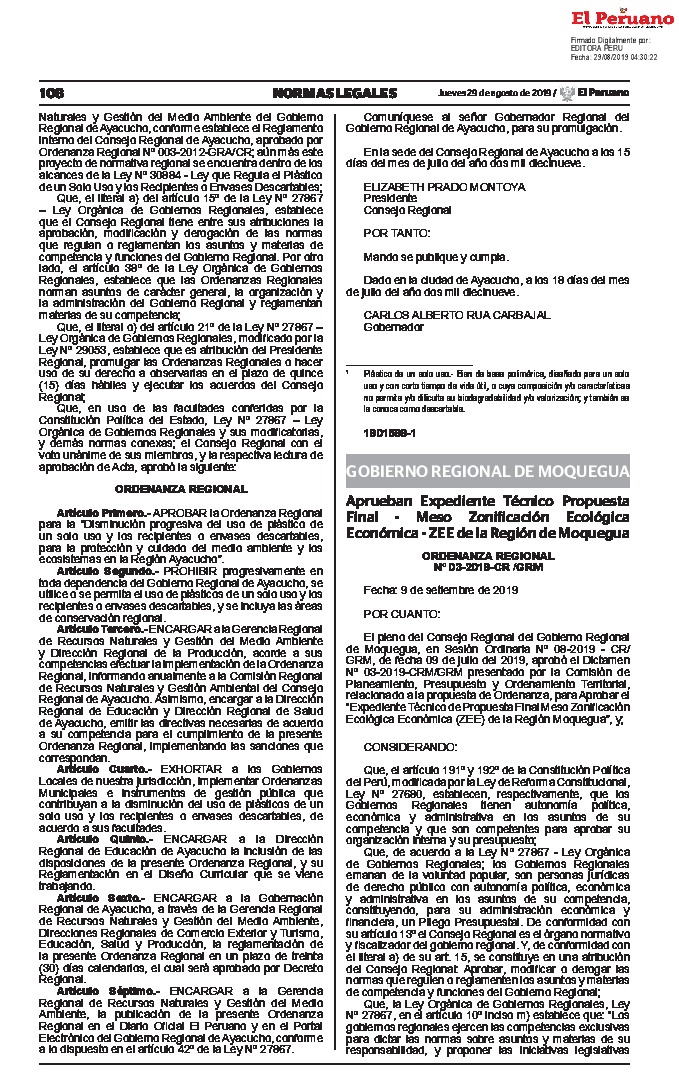 La presente norma aprueba la Propuesta Final – Meso Zonificación Ecológica y Económica ZEE de la Región Moquegua, a escala 1:100, 000, como parte de los instrumentos técnicos del proceso de Ordenamiento Territorial, el cual consta de un (01) Informe final sobre los Sub modelos y la Propuesta Final de la Zonificación Ecológica y Económica con su respectivo mapa temático.