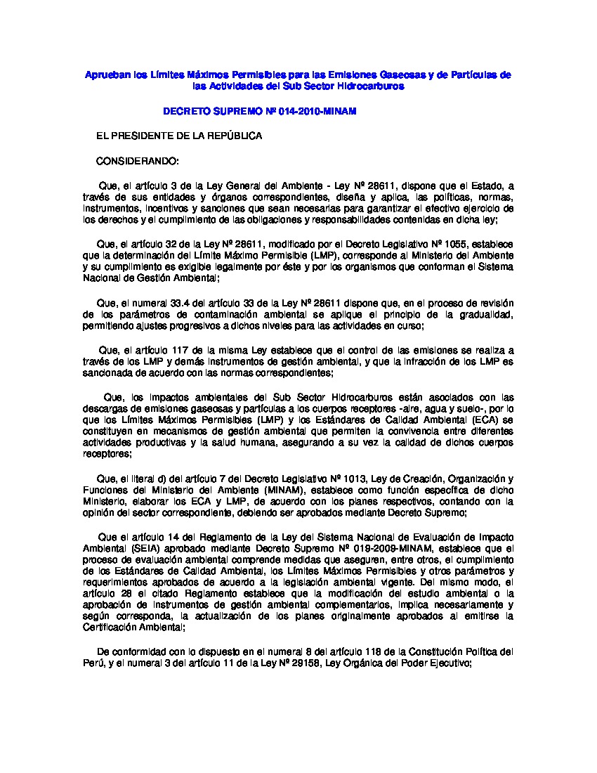 Aprueban los Límites Máximos Permisibles para las Emisiones Gaseosas y de Partículas de las Actividades del Sub Sector Hidrocarburos