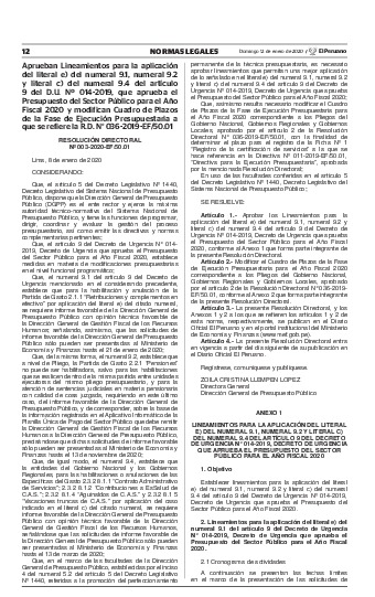 Aprueban Lineamientos para la aplicación del literal e) del numeral 9.1, numeral 9.2 y literal c) del numeral 9.4 del artículo 9 del D.U. Nº 014-2019, que aprueba el Presupuesto del Sector Público para el Año Fiscal 2020 y modifican Cuadro de Plazos