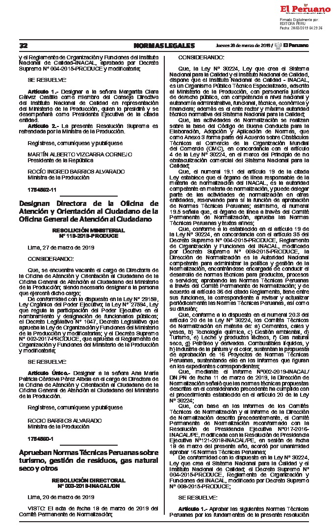 Aprueban Normas Técnicas Peruanas sobre turismo, gestión de residuos, gas natural seco y otros