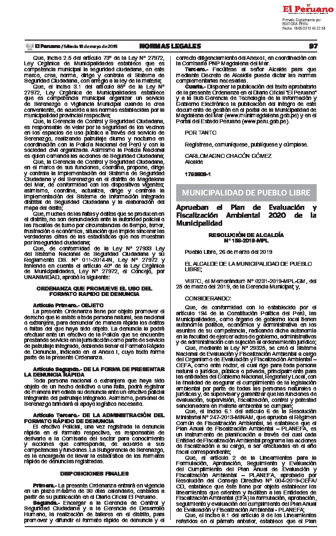 La presente resolución de alcaldía aprueba Plan Anual de Fiscalización Ambiental – PLANEFA 2020 de la Municipalidad distrital de Pueblo Libre, como un instrumento de planificación a través del cual la municiplaidad en su caldiad de Entidad de Fiscalización Ambiental programa las acciones de fiscalización a su cargo, a ser efectuadas en el año fiscal correspondiente.