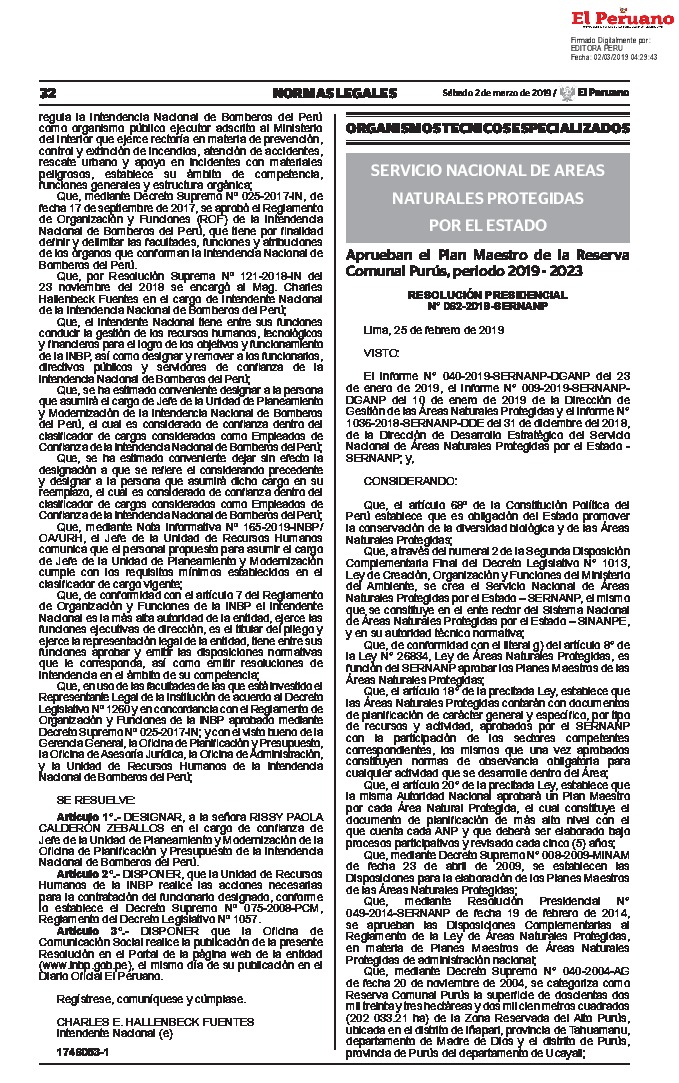 Resolución aprueba el Plan Maestro de la Reserva Comunal Purús, periodo 2019 - 2023, como documento de planificación de más alto nivel de la referida Área Natural Protegida.