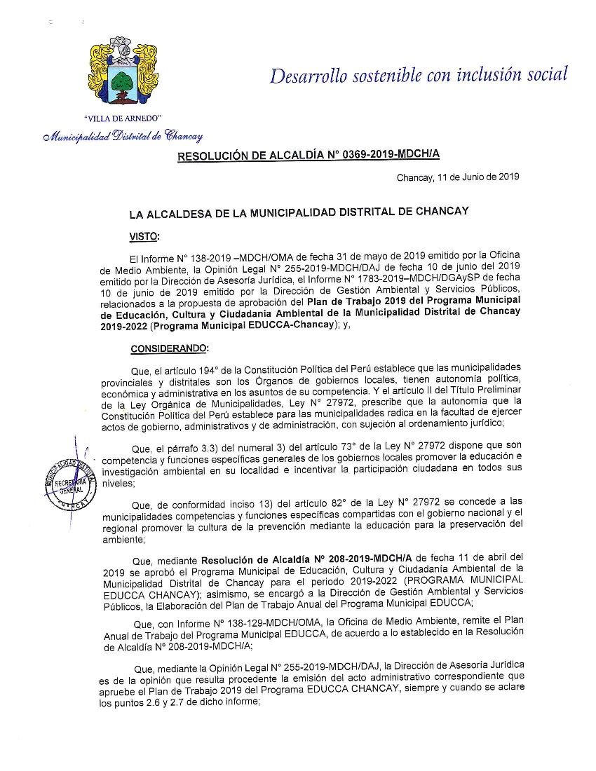 La presente Resolución de Alcaldía aprueba el Plan de Trabajo 2019 del Programa Municipal de Educación, Cultura y Ciudadanía Ambiental de la Municipalidad Distrital de Chancay, provincia de Huaral, para el periodo 2019; con la finalidad de definir las actividades de educación, cultura y ciudadanía ambiental a realizarse en la localidad.
