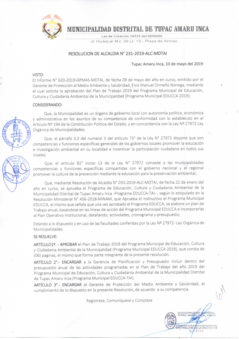 La presente Resolución de Gerencia Municipal aprueba el Plan de Trabajo 2019 del Programa Municipal de Educación, Cultura y Ciudadanía Ambiental de la Municipalidad Distrital de Túpac Amaru Inca, distrito de Pisco, para el periodo 2019; con la finalidad de definir las actividades de educación, cultura y ciudadanía ambiental a realizarse en la localidad.